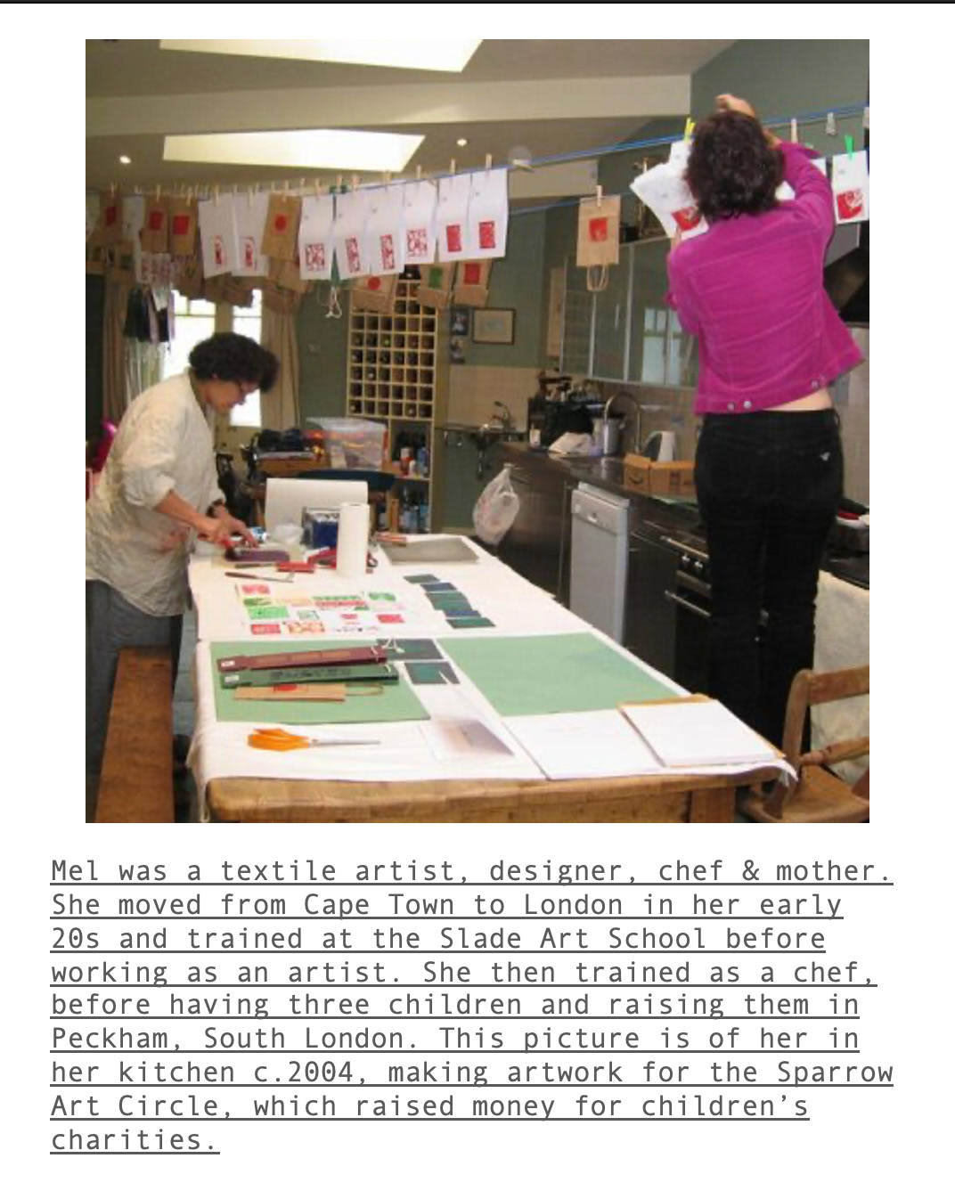 Who is Next Door? Valentine and Emeline are in the space next door discovering the textile artist Mel Heneke Eliot, who left all of her materials to her children when she died ten years ago. Peek into the room where we uncover the precious dyes, pigments and silks that Mel used when she worked as a fabric designer. This installation is our documentation of the process of dying and printing with Mel's materials. Through active and embodied research we ask ourselves: what can we learn from this artist? How do materials hold memory? What is the value of experimentation today?