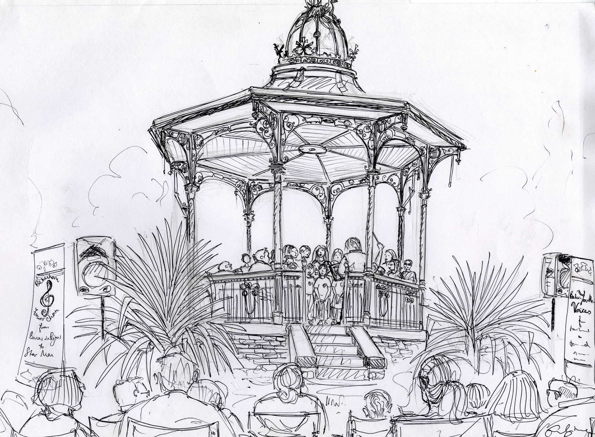 Sketches of the Hidden Door Festival (Leith, Scotland) - 'Electronic strings: Wolf and McBride playing to Metropolis', 'Watching Metropolis in the Old Leith Theatre auditorium', 'Barney's Beer Mini Van' - Blue Biro, one A4 sheet of paper, June 2017.