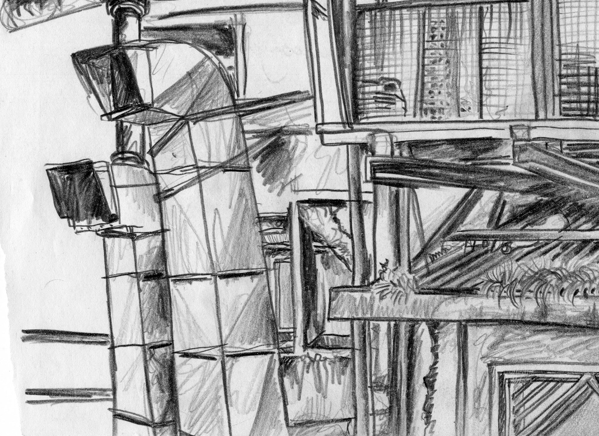 Above from top left to right: 'A Marchmont facade' (Edinburgh, Scotland), black Biro, A5, June 2015. 'Pigeons and wires in Indra Vihar' (Delhi, India), black ink, A3, Autumn 2015. 'The new block on B.B. Marg' (Delhi, India), black ink, A3, Autumn 2015. 'Vents and Grills' (Dharamsala, India), graphite pencil, A5, May 2016. 'Stacked on the station: hoover, bike, fountain and kiosk' (Siliguri, India), black Biro, A3, June 2016. 'Beckenham Junior Choir singing David Bowie' (Beckenham Rec. Bandstand, England), black Biro, A3, June 2016. 'Roof tiles and plastic pigeons' and 'Two doors' (Montpelier, France), black ink, A5, June 2016. 'The Brazilian Pancake box' (Forest Road, Edinburgh), blue Biro, A5, winter 2017.
